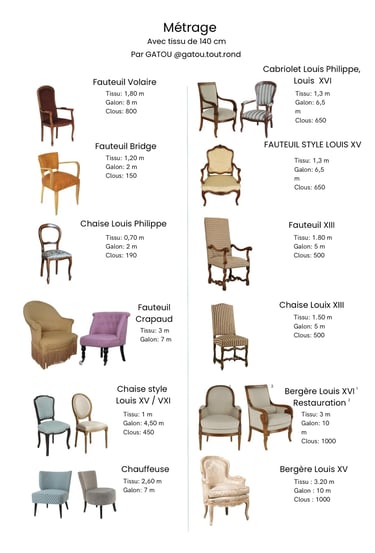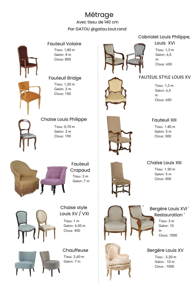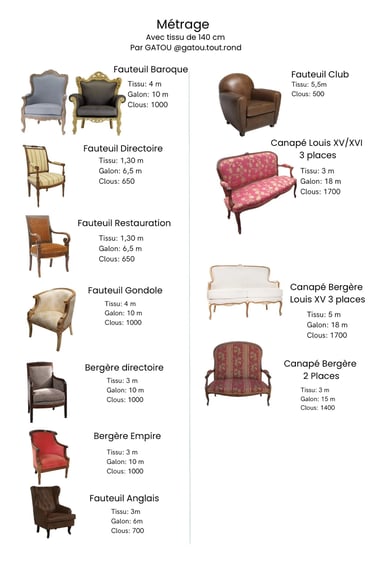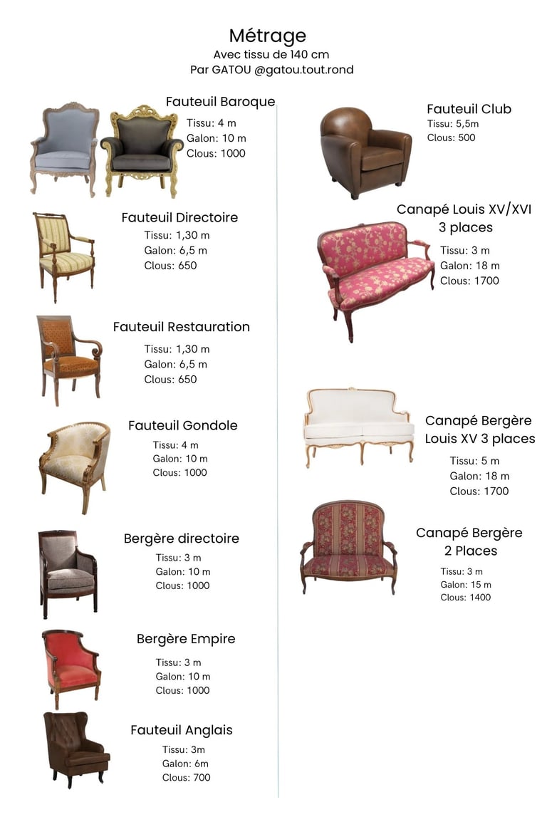 Pour vous aider à estimer la quantité nécessaire, vous retrouvez ci-joint une liste récapitulative avec les métrages indicatifs selon les types de fauteuils et canapés les plus courants.
